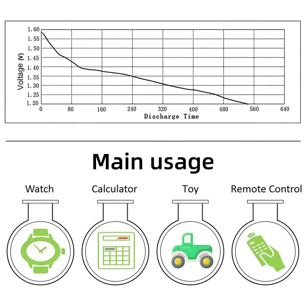 Used for toys, calculators, laser pointers, cameras, clocks, watches,pedometer, computers, games, digital cameras, camcorders, PDAs, remote controls, electronic instruments, digital voice recorders, blood glucose meters, cholesterol testing meters, LED light.
