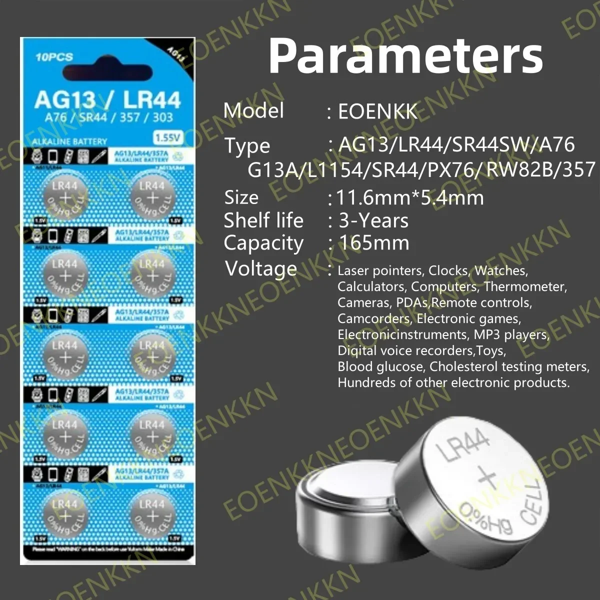 Compatible Models: A76, A76-1,1166, 1166A, 1107SO, 1131SO, 157, 303, 357, 357A, 675, 76A, CA18, CA19, CX44, D357/303,G13,G13A,GP76A,GPA76,GP357,L1154,LR1154,LR44,LR44H,PX76,PX76A,RW82,S76,SR44,SR44W,SR1154,SP357,V357,V13GA.
