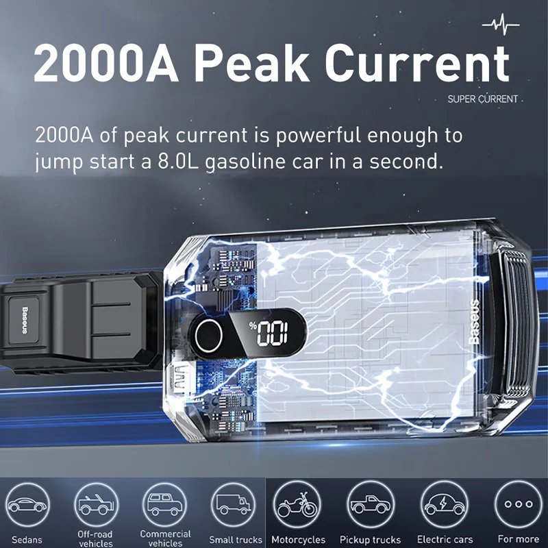 2000A of peak current is powerful enough to jump start a 8.0L gasoline car in a second.