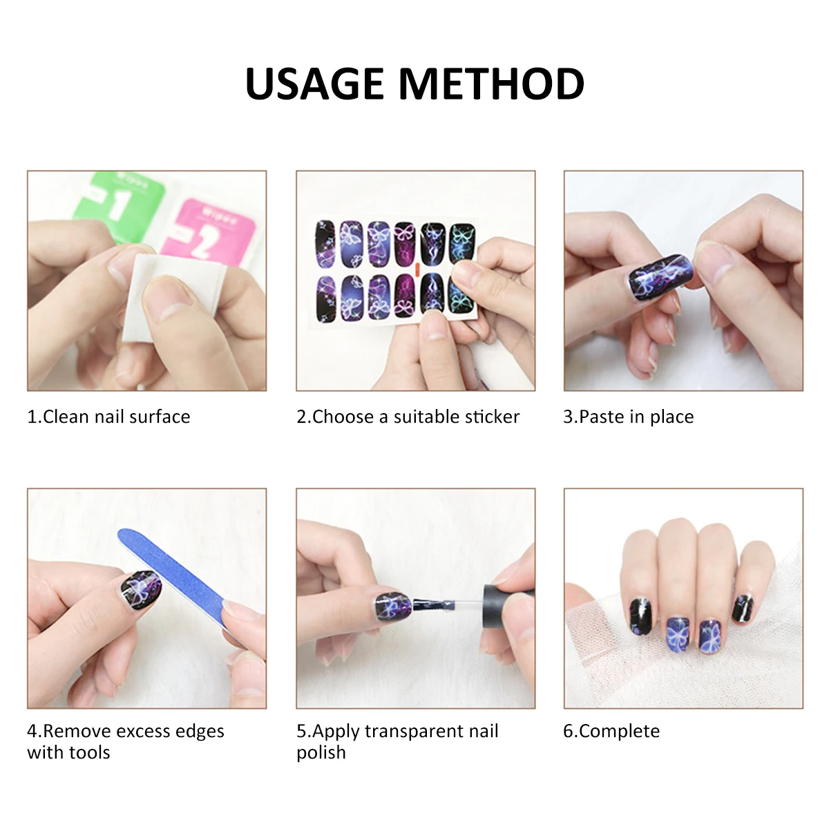 [Easy to Use] Use our file nail to push back the cuticle before using our nail stickers, then stick the sticker along the edge of the nail and press it gently and repeatedly to make it stick with your nail more firmly. (If applied correctly, it will be more durable and maintain a shiny appearance)