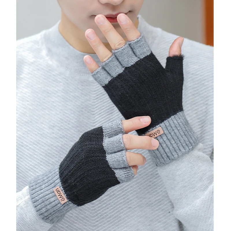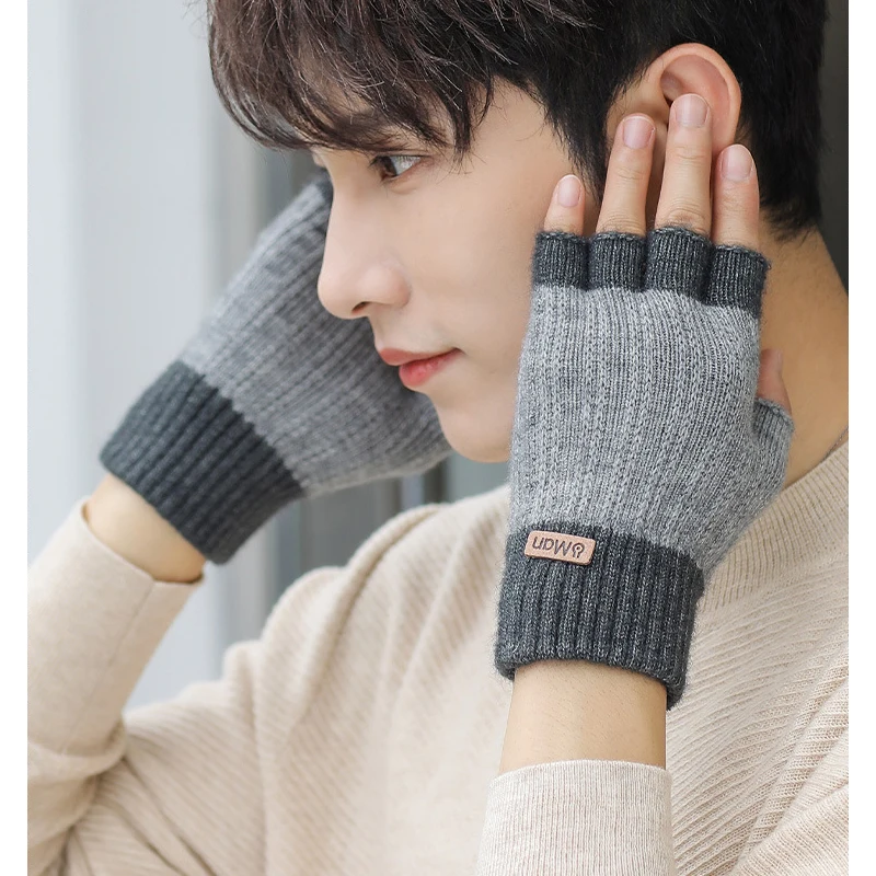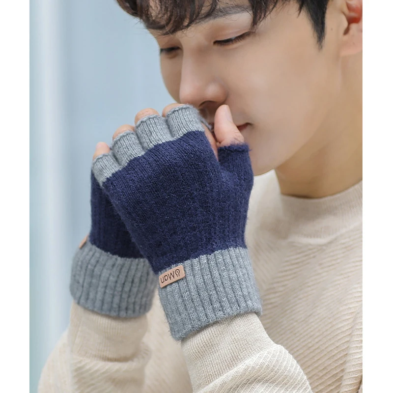 Men Winter Fingerless Half Finger Knitted Gloves Office Knitted Warm Exposed Finger Thick Gloves Elastic Driving Gloves