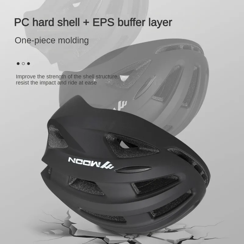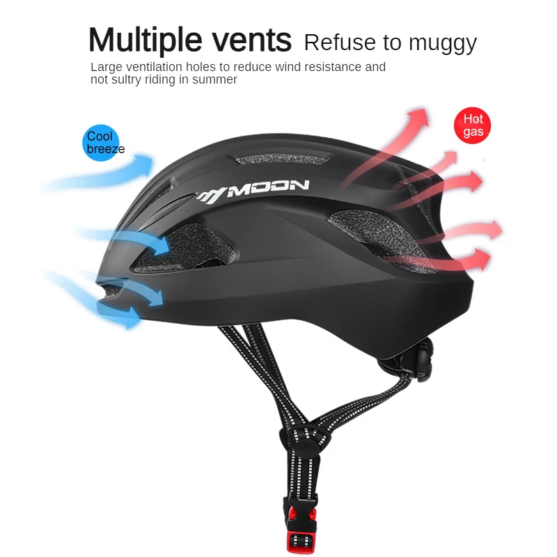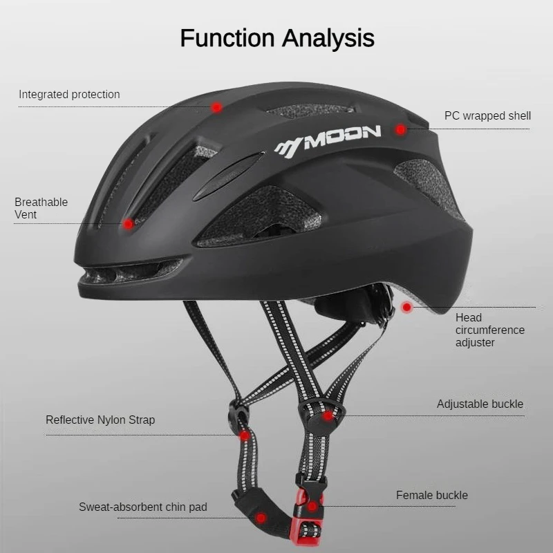 1. One-Piece Bike Helmet Construction: MOON cycling helmets adopts a one-piece construction with a shock-absorbing PC material outer shell and EPS inner foam (made in the USA). Its crafted design is not glued together like other MTB bike helmets, and the external shell fully covers the EPS foam, which ensures a longer-lasting durable yet safer structure. This safety technology is lightweight yet super tough and provides all-around protection for your head while riding.
