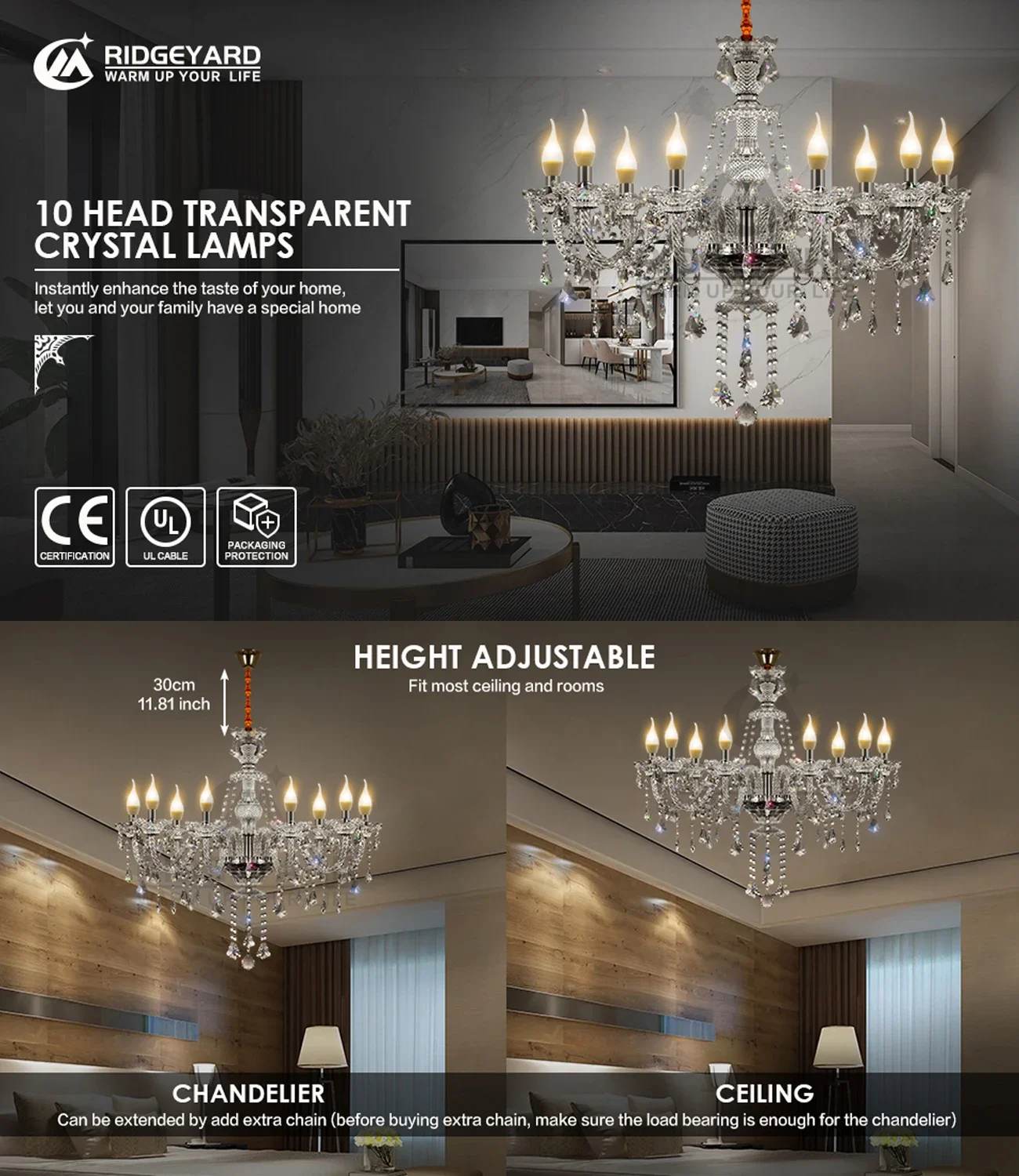 Assemble: It is recommended to ask professionals to install the crystal ceiling lamp. Due to the crystal lamp accessories are more complicated, the combined installation will take some time to complete.