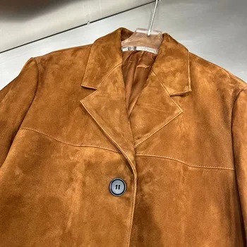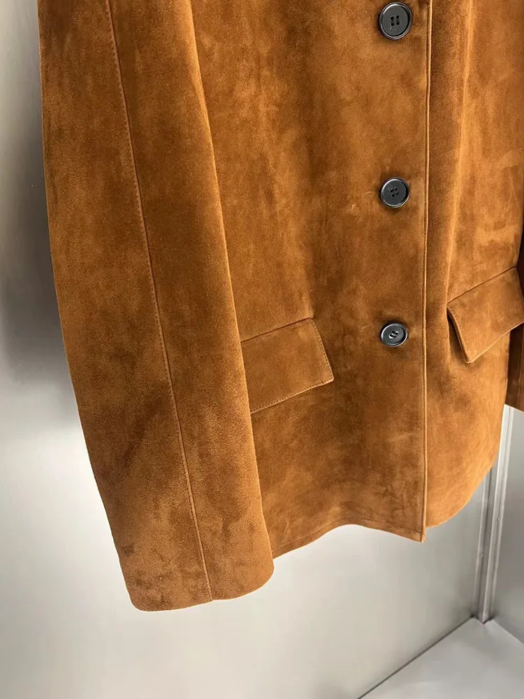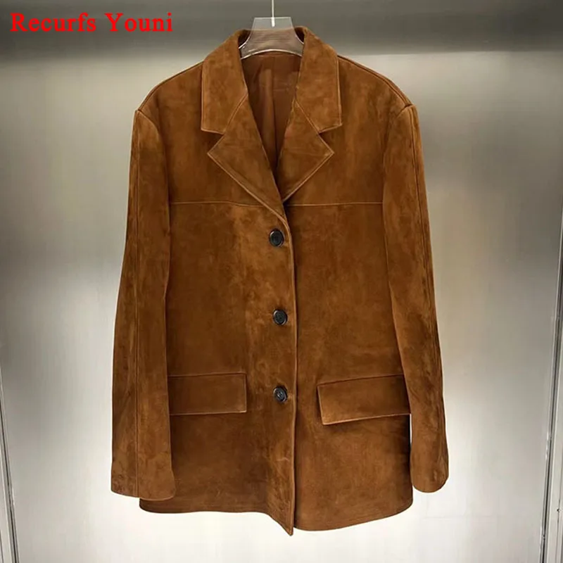 Vintage Brown Kid Suede Jacket for Women 2023 New High Sense Loose