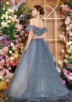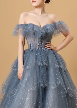 Women Long Blue Tulle Off Shoulder A-Line Empire Prom Sparkly Sequins Evening Dresses Party Graduation Formal Ball Gown